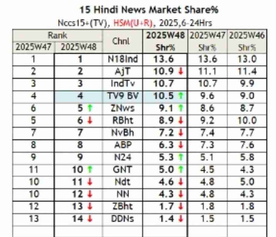 हिंदी के टॉप-10 न्यूज़ चैनलों की TRP आ गई है। ताज़ा टीआरपी आंकड़ों के अनुसार, न्यूज़18 इंडिया (News18 India) ने फिर नंबर-1 की पोज़िशन बरकरार रखी है। दूसरे स्थान पर आजतक (AajTak) बना हुआ है, जबकि तीसरे नंबर पर इंडिया टीवी (India TV) क़ाबिज़ है। चौथे स्थान पर टीवी9 भारतवर्ष (TV9 Bharatvarsh) ने अपनी जगह बनाई है और पांचवें नंबर पर ज़ी न्यूज़ (Zee News) है, वहीं 6 नंबर पर Republic Bharat और 7 नंबर पर टाइम्स नाउ नवभारत (Times Now Navbharat) है। बाकी चैनलों की टीआरपी इस प्रकार है।