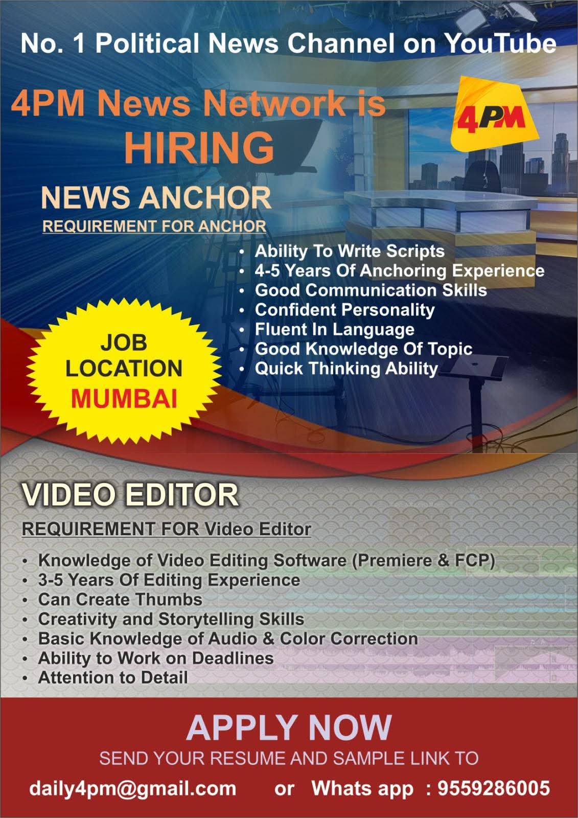 4 PM News Network – मुंबई ऑफिस के लिए भर्ती