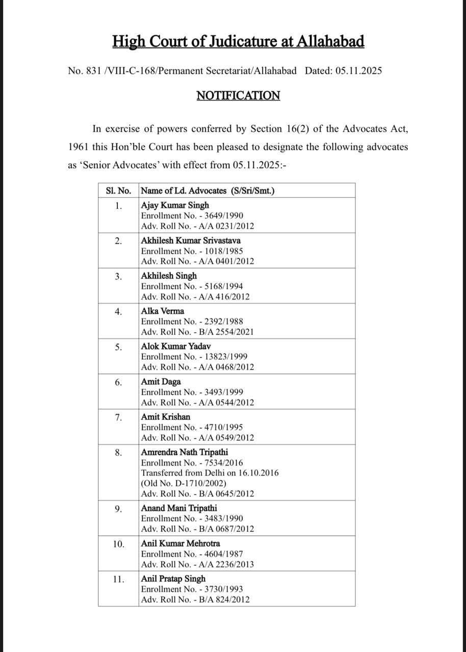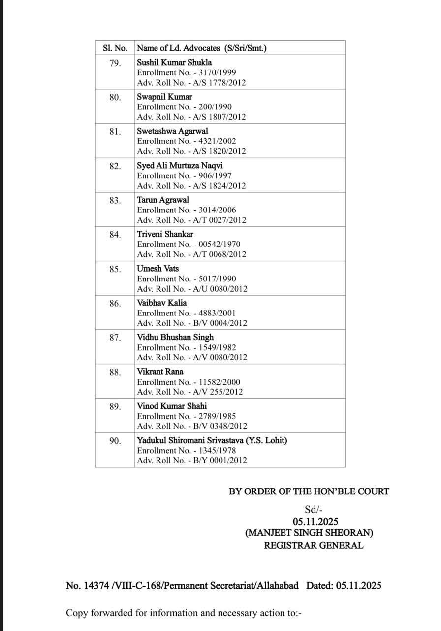 इलाहाबाद हाईकोर्ट ने 90 अधिवक्ताओं को सीनियर एडवोकेट के रूप में नामित किया,पांच महिला अधिवक्ता शामिल,सबसे पहले यहां देखिए जारी हुई पूरी लिस्ट