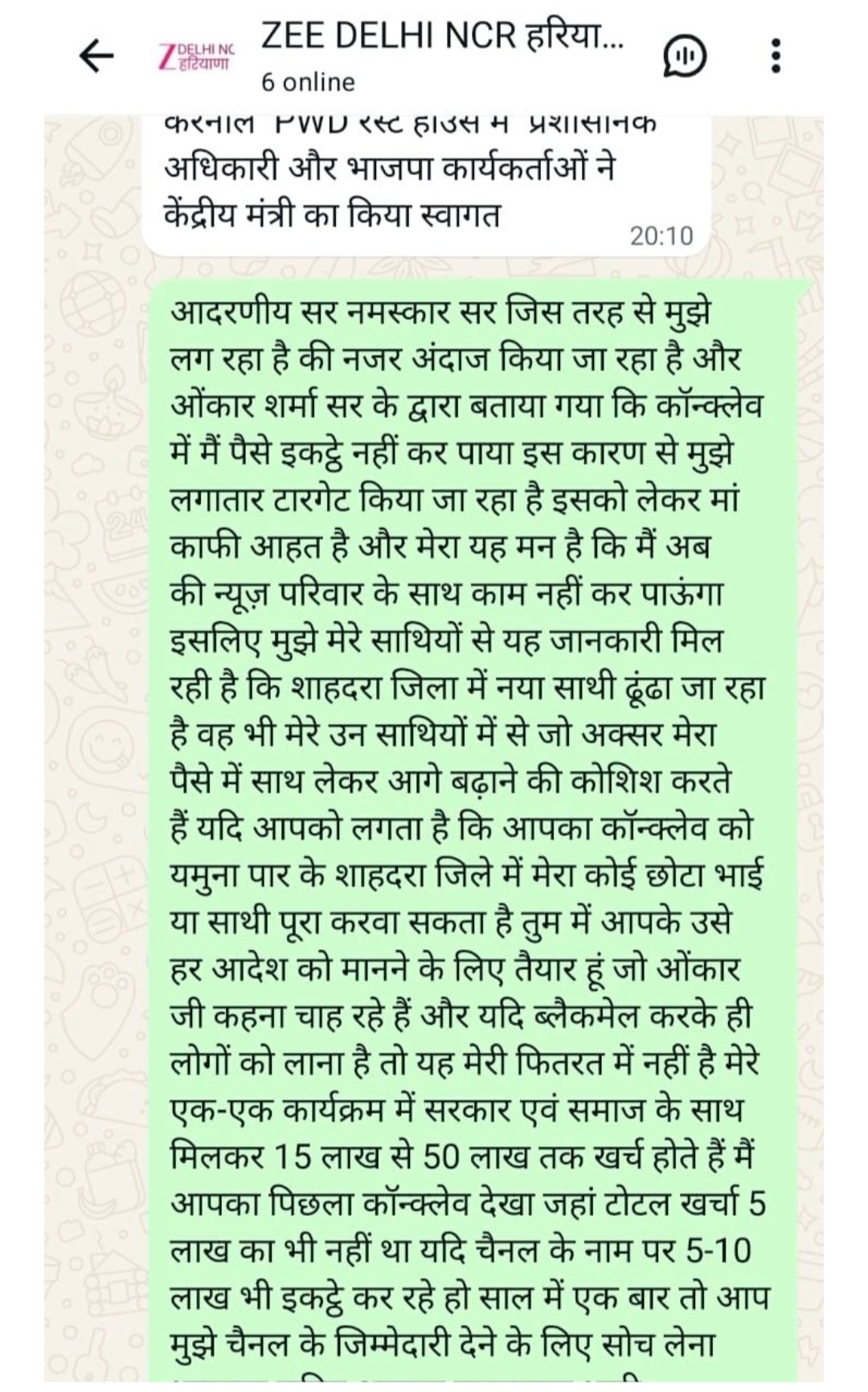 ज़ी न्यूज़ से जुड़ा एक गंभीर मामला सामने आया है, जिसमें चैनल के भीतर पैसों की उगाही, टारगेटिंग और काम से बाहर करने जैसे आरोप लगाए गए हैं। यह आरोप एक रिपोर्टर के व्हाट्सऐप मैसेज के जरिए सामने आए हैं, जिसमें संगठन की कार्यप्रणाली पर गंभीर सवाल खड़े किए गए हैं। “ज़ी न्यूज़ दिल्ली एनसीआर हरियाणा” के एक व्हाट्सएप ग्रुप में रिपोर्टर द्वारा डाला गया संदेश पढ़ें-