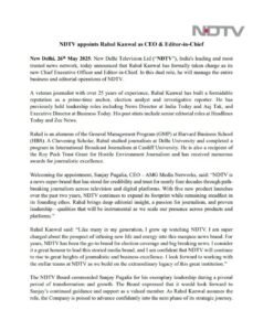 देश के प्रतिष्ठित न्यूज़ नेटवर्क NDTV ने राहुल कंवल को अपना नया CEO और एडिटर-इन-चीफ नियुक्त किया है। इस दोहरी भूमिका में वे NDTV के व्यावसायिक और संपादकीय संचालन की पूरी ज़िम्मेदारी निभाएंगे। पत्रकारिता के क्षेत्र में 25 वर्षों से अधिक अनुभव रखने वाले राहुल कंवल इससे पहले इंडिया टुडे, आज तक और बिजनेस टुडे जैसे प्रतिष्ठानों में महत्वपूर्ण पदों पर कार्य कर चुके हैं।