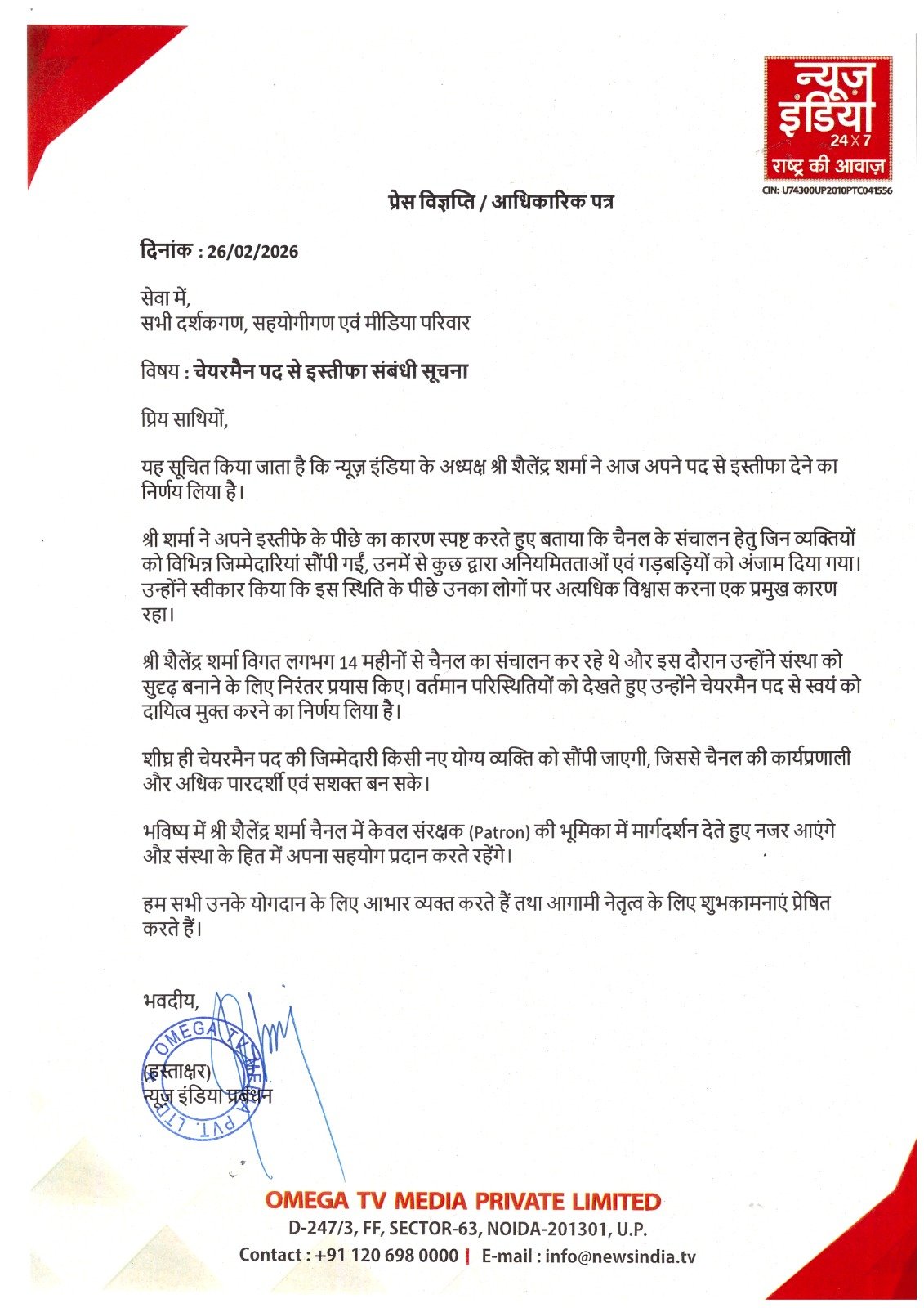 न्यूज़ इंडिया के अध्यक्ष शैलेंद्र शर्मा ने औपचारिक रूप से अपने पद से इस्तीफा दे दिया है। अपने इस्तीफे के साथ जारी स्पष्टीकरण में उन्होंने संस्थान के भीतर हुई हालिया नियुक्तियों और प्रशासनिक निर्णयों पर गंभीर आपत्तियां दर्ज कराई हैं।