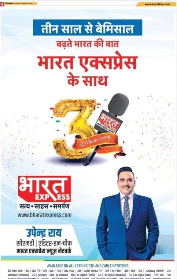 चेयरमैन उपेंद्र राय के नेतृत्व में ‘भारत एक्सप्रेस’ न्यूज चैनल की बड़ी उपलब्धि,सफलता के साथ पूरे किए तीन साल