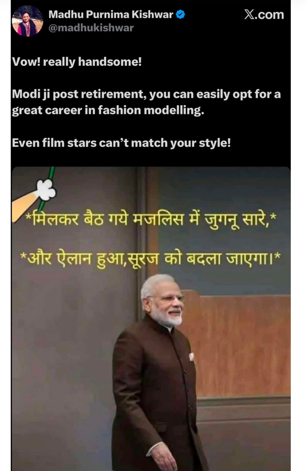 2013-2014 का दौर था, मधु किश्वर जी इंडिया न्यूज के दफ़्तर आतीं और तब के तत्कालीन सीएम नरेन्द्र मोदी के कसीदे पढ़ते थकती नहीं थी. “मोदीनामा” किताब का शीर्षक आपको सबकुछ बता देगा. मोदी ने जब उनकी किताब के लिये इंटरव्यू दिया तो उसे इंडिया न्यूज पर चलाया जाना था. मोदी को नुक़सान ना हो, उनकी कोई ग़लत बात नहीं जाए, उनकी छवि पर असर ना पहुँचे, मोदी नाराज़ ना हो जायें, मोदी जैसा अच्छा इंसान मैंने नहीं देखा, ये बातें संपादकों पत्रकारों से न्यूज रूम में शेयर करते मधु किश्वर नहीं थकती थीं. मैं उस समय बदलते राजनीतिक माहौल के बीच पत्रकारिता सीख रही थी.