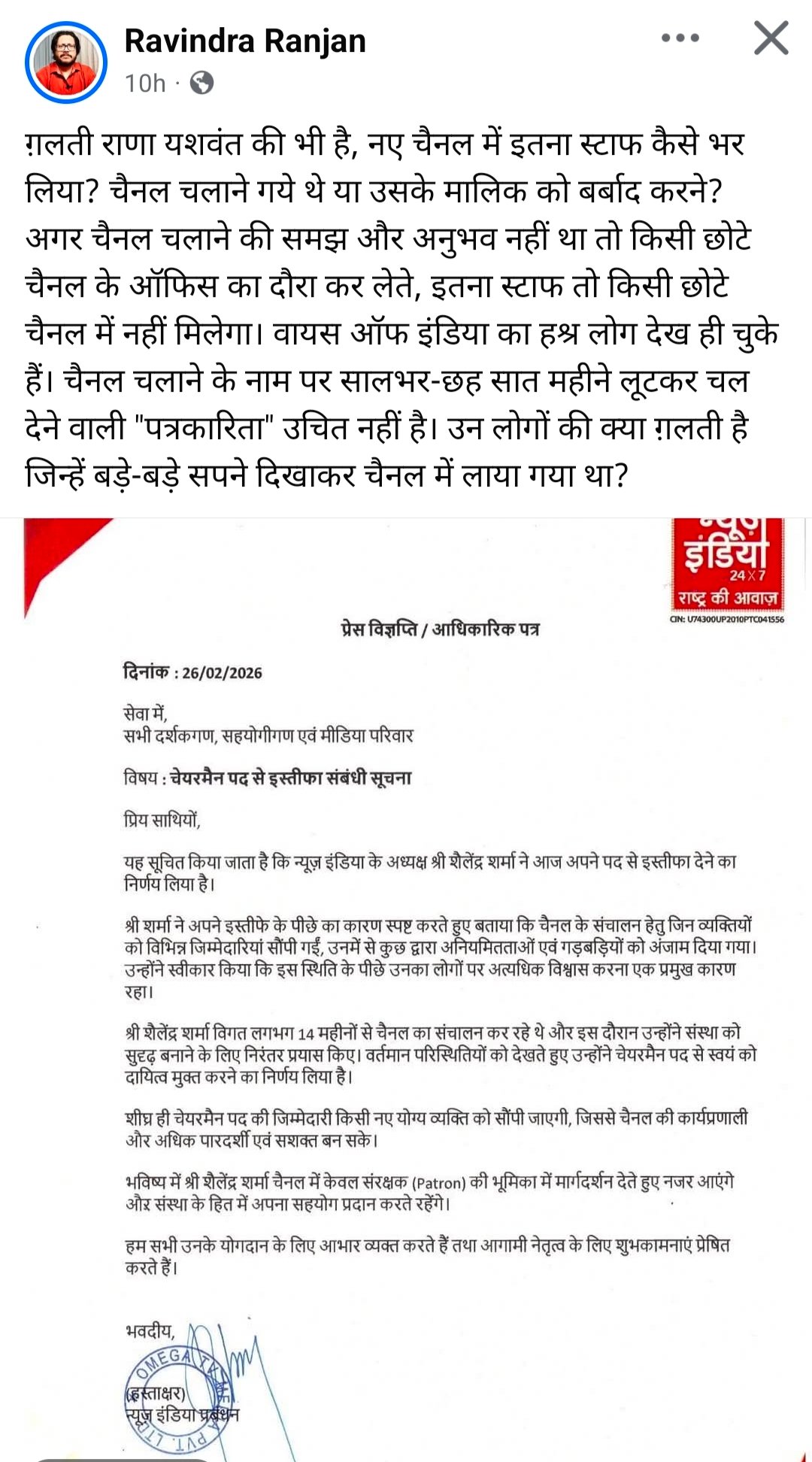 सोशल मीडिया पर रविंद्र रंजन की यह पोस्ट अब चर्चा का विषय बन गई है। यह सवाल तेजी से उठ रहा है कि क्या न्यूज़ इंडिया के मालिक को गुमराह किया गया? क्या चैनल के वर्तमान हालात के लिए केवल प्रबंधन की गलतियां जिम्मेदार हैं या यह एक सोची-समझी “बर्बादी” की कहानी है?