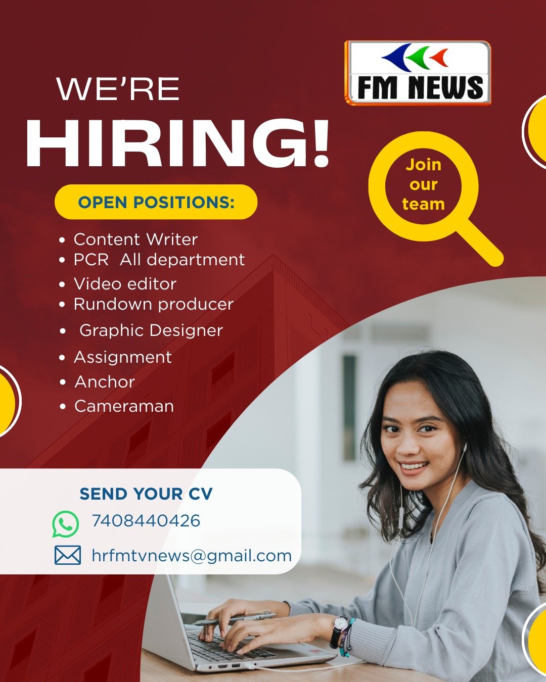 क्या आप मीडिया और पत्रकारिता की दुनिया में बदलाव लाने के लिए तैयार हैं? FM NEWS चैनल को ऐसे उत्साही और प्रतिभाशाली प्रोफेश्नल्स की तलाश है जो हमारी टीम का हिस्सा बनकर निष्पक्ष और सटीक खबरें दुनिया तक पहुँचाने में मदद कर सकें।