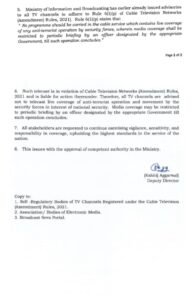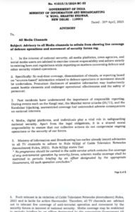 सरकार की ओर से जारी इस एडवाइजरी में कहा गया है कि केबल टेलीविजन नेटवर्क (संशोधन) नियम, 2021 के तहत ऐसी लाइव रिपोर्टिंग कानून का उल्लंघन मानी जाएगी और इस पर कार्रवाई भी हो सकती है। मंत्रालय ने स्पष्ट किया है कि सुरक्षा अभियानों की जानकारी केवल सरकार द्वारा नियुक्त अधिकारी के जरिए दी जाएगी और तब तक मीडिया को इन गतिविधियों से दूरी बनाकर रखनी होगी।
