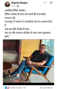 दैनिक भास्कर के स्थानीय संपादक ने सोशल मीडिया पोस्ट लिखकर इस्तीफा दिया,आरोपों के संबंध में राजेश रंजन का पक्ष,पढ़िए