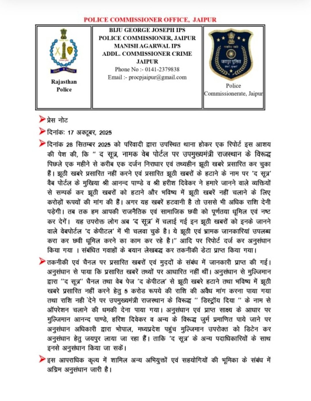 न्यूज़ पोर्टल द सूत्र के मैनेजिंग एडिटर और सम्पादक को राजस्थान की जयपुर पुलिस कल उठा ले गई। इनमें एक हरीश दिवेकर और आनंद पांडेय का नाम शामिल है। दोनों पत्रकार लगातार उप-मुख्यमंत्री दीया कुमारी की पोल पट्टी खोल रहे थे। जो सरकार बहादुर को नागवार गुजरी।