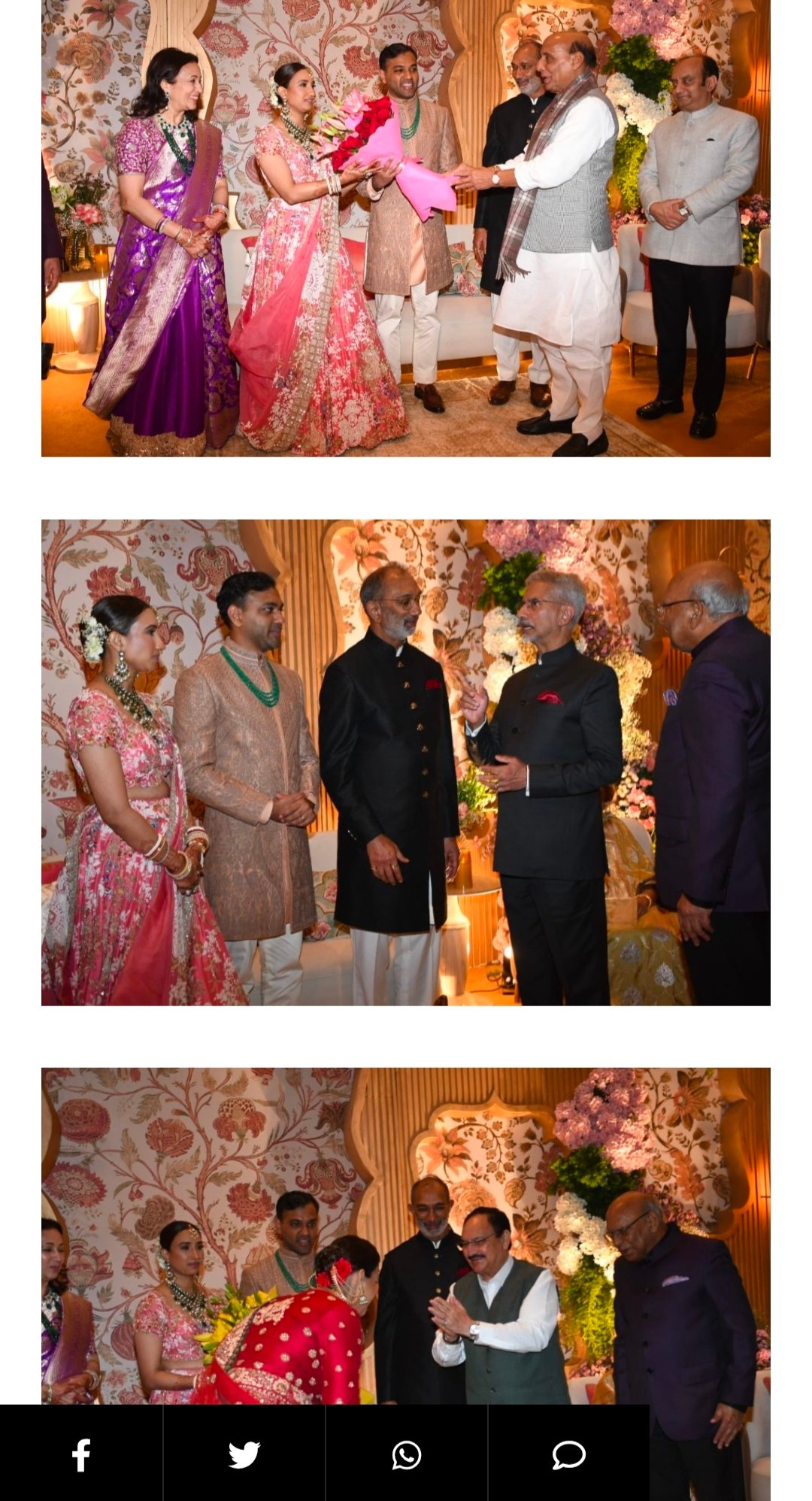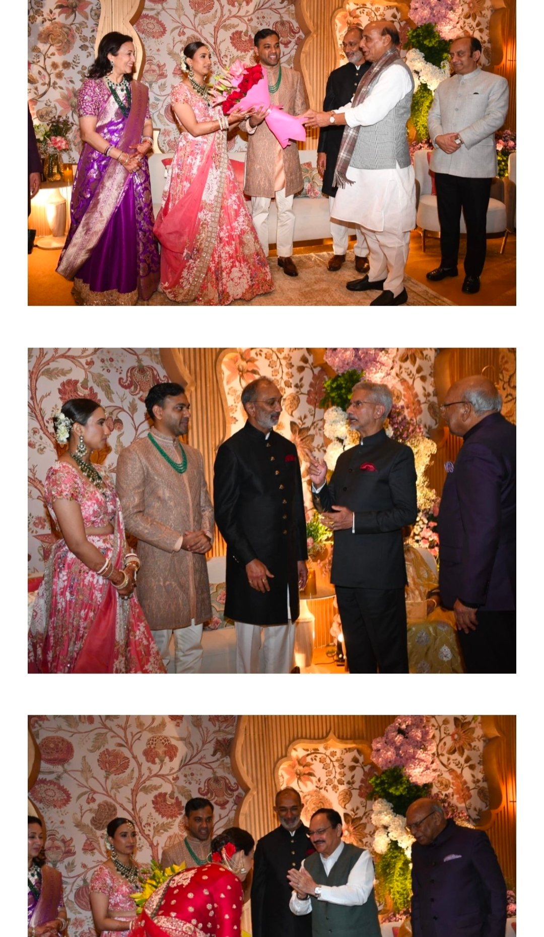 ​इस हाई-प्रोफाइल वैवाहिक आयोजन में भारतीय राजनीति के सबसे कद्दावर चेहरों ने शिरकत की। गृह मंत्री अमित शाह और रक्षा मंत्री राजनाथ सिंह ने वर-वधु से मिलकर उन्हें शुभकामनाएं दीं। इसके साथ ही विदेश मंत्री डॉ. एस. जयशंकर और केंद्रीय स्वास्थ्य मंत्री व भाजपा के राष्ट्रीय अध्यक्ष जेपी नड्डा भी इस खास मौके के साक्षी बने।
