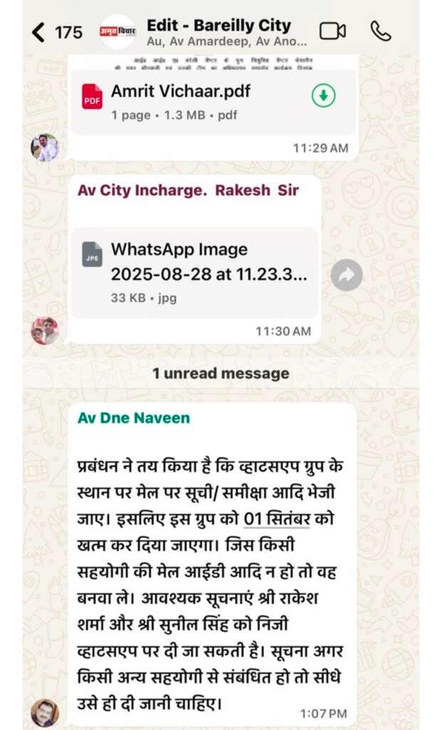 सूत्रों के अनुसार, कर्मचारियों के बीच बढ़ते आक्रोश और संस्थान के भीतर की बात बाहर आने से रोकने के लिए नवीन गुप्ता ने गुरुवार को नया फरमान जारी कर दिया। आदेश के मुताबिक 1 सितंबर 2025 से अमृत विचार के सभी व्हाट्सएप ग्रुप बंद कर दिए जाएंगे।