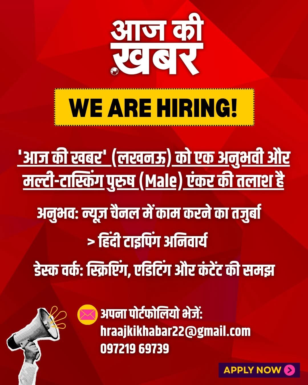 ‘आज की खबर’ (लखनऊ) को तलाश है एक ऐसे पुरुष एंकर (Male Anchor) की, जिसके पास खबरों की गहरी समझ और स्टूडियो का तजुर्बा हो। हम सिर्फ एक चेहरा नहीं, बल्कि एक ‘ऑल-राउंडर’ न्यूज़मैन ढूंढ रहे हैं।