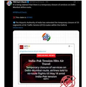 - एनडीटीवी ने दावा किया कि दिल्ली-मुंबई एयरलाइन रूट पर सेवाओं को अस्थायी रूप से बंद किया गया है। प्रेस इंफॉर्मेशन ब्यूरो (PIB) ने इस खबर का खंडन किया है।