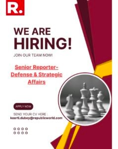 रिपब्लिक टीवी में रक्षा और रणनीतिक मामलों पर रिपोर्टिंग करने के इच्छुक पत्रकारों के लिए सुनहरा अवसर है। इस पद के लिए आवेदकों को अपने बायोडाटा keerti.dubey@republicworld.com पर भेजना होगा। इच्छुक उम्मीदवारों को डिफेंस, जियोपॉलिटिक्स और स्ट्रैटेजिक इशूज़ की गहरी समझ होनी चाहिए।