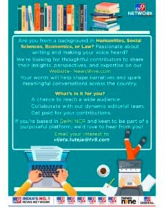 टीवी9 की डिजिटल वेबसाइट News9live.com उन लेखकों और विशेषज्ञों को आमंत्रित कर रही है जो ह्यूमैनिटीज़, सोशल साइंसेज़, इकनॉमिक्स या लॉ जैसे क्षेत्रों से आते हैं। इसके लिए दिल्ली-एनसीआर में रहने वाले इच्छुक लोग vijeta.tuteja@tv9.com पर ईमेल कर सकते हैं। चैनल इन विचारशील लेखकों को उनके योगदान के लिए भुगतान भी करेगा और देशभर में उन्हें व्यापक मंच देने का वादा करता है।