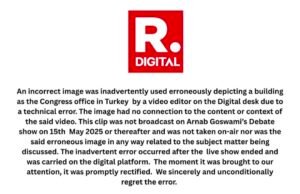 अर्नब ने तुर्किये में इस्तांबुल कांग्रेस सेंटर की फोटो दिखाकर उसे भारत में कांग्रेस पार्टी का ऑफिस बताया. जब खबर आई कि कांग्रेस मुकदमा करेगी, तब उनके चैनल रिपब्लिक ने सारा ठीकरा किसी वीडियो एडिटर पर फोड़ दिया. अर्नब को कम से कम इतनी ग़ैरत तो रखनी चाहिए थी कि खुद की गलती मानते