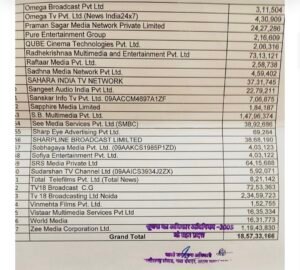 अनाम कंपनियों की एंट्री: सूची में ओमेगा ब्रॉडकास्ट, संगीत ऑडियो, सौभाग्य मीडिया, सोफिया एंटरटेनमेंट और जयपुर मीडिया जैसे नाम शामिल हैं। आरोप है कि इनमें से कई का विज्ञापन के क्षेत्र में कोई बड़ा ट्रैक रिकॉर्ड नहीं है।