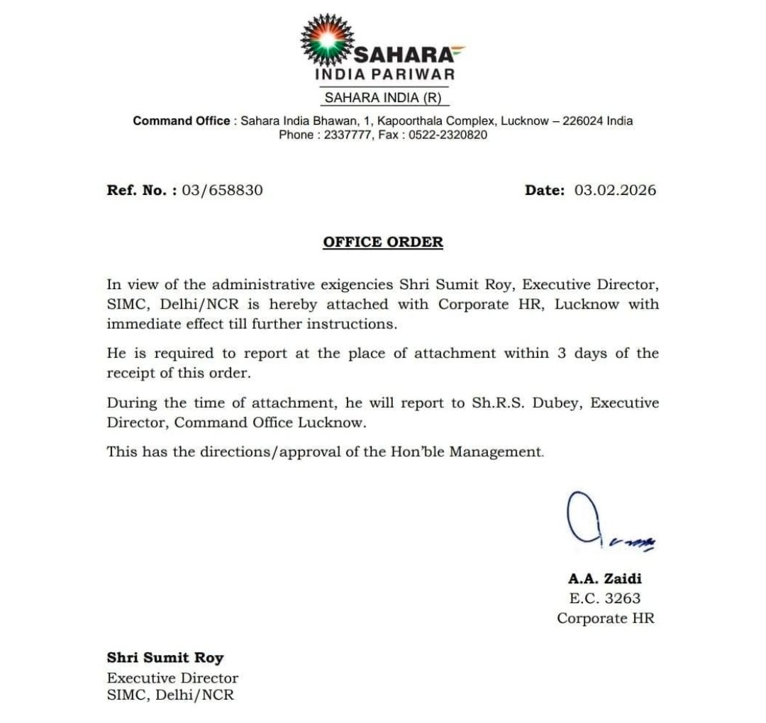सहारा इंडिया द्वारा जारी आधिकारिक आदेश के अनुसार, सुमित राय (Executive Director, SIMC) को अब कॉर्पोरेट HR, लखनऊ के अधीन कर दिया गया है। उन्हें 3 दिन के भीतर लखनऊ रिपोर्ट करने को कहा गया है, जहाँ वे कार्यकारी निदेशक आर.एस. दूबे को रिपोर्ट करेंगे।