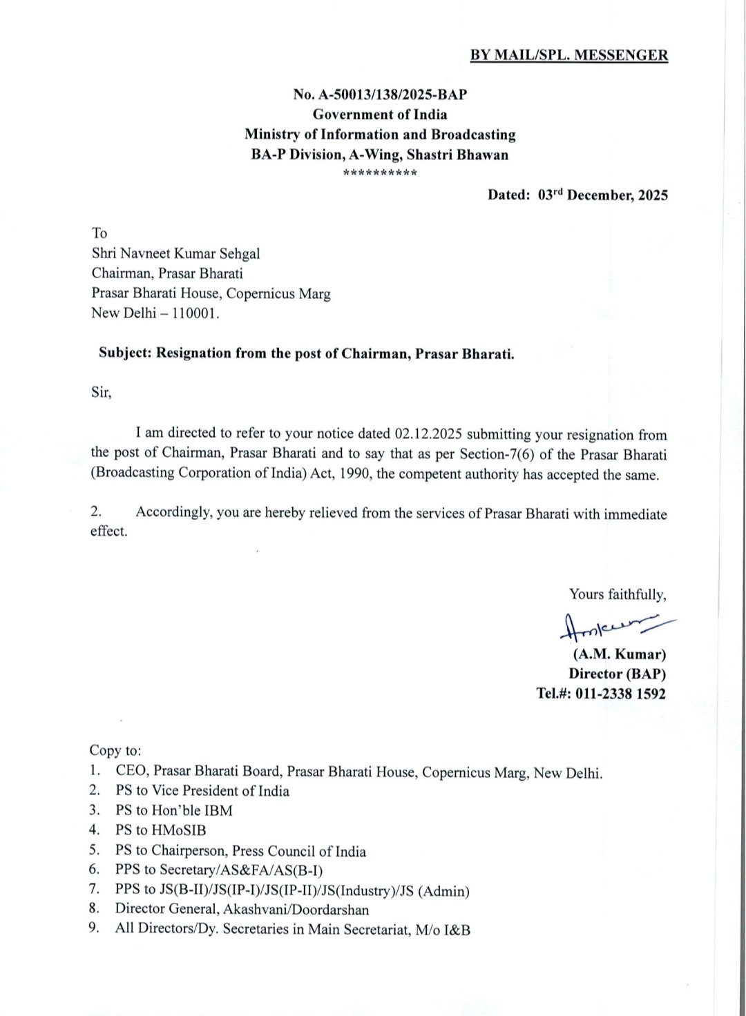 सूत्रों के अनुसार, उन्होंने 2 दिसंबर को अपना इस्तीफा सौंप दिया, जिसे सूचना एवं प्रसारण मंत्रालय ने प्रसार भारती अधिनियम, 1990 की धारा 7(6) के तहत तत्काल प्रभाव से स्वीकार भी कर लिया है।
