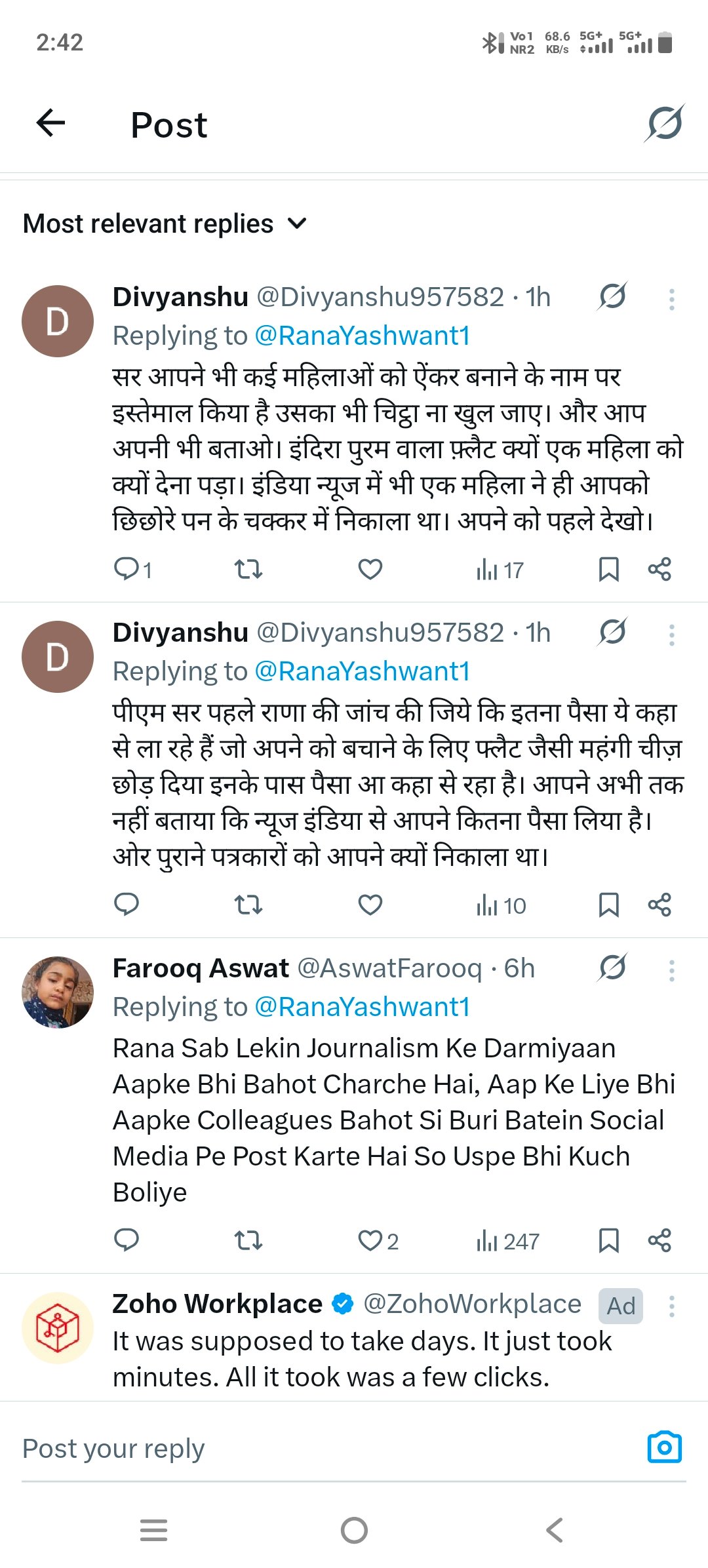 ​एंकर बनाने के नाम पर शोषण: यूजर का दावा है कि राणा यशवंत ने कई महिलाओं को एंकर बनाने का झांसा देकर उनका इस्तेमाल किया है और जल्द ही इसका पूरा ‘चिट्ठा’ खुलने वाला है। गंभीर आरोप ये भी हैं की हाल ही में न्यूज इंडिया चैनल में राणा यशवंत के ज्वाइन करते हुए एक वरिष्ठ महिला एंकर ने चैनल से इस्तीफा दे दिया उसका बड़ा कारण भी राणा यशवंत ही रहें हैं