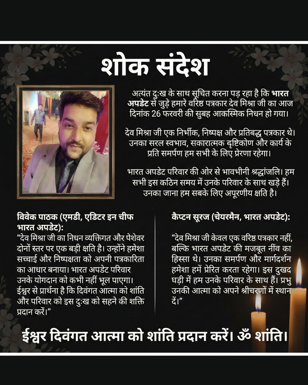 ’भारत अपडेट’ परिवार इस कठिन समय में देव मिश्रा जी के परिवार के प्रति अपनी गहरी संवेदना व्यक्त करता है। उनका जाना न केवल संस्थान के लिए, बल्कि समूचे पत्रकारिता जगत के लिए एक बड़ा शून्य छोड़ गया है जिसे भर पाना असंभव है।