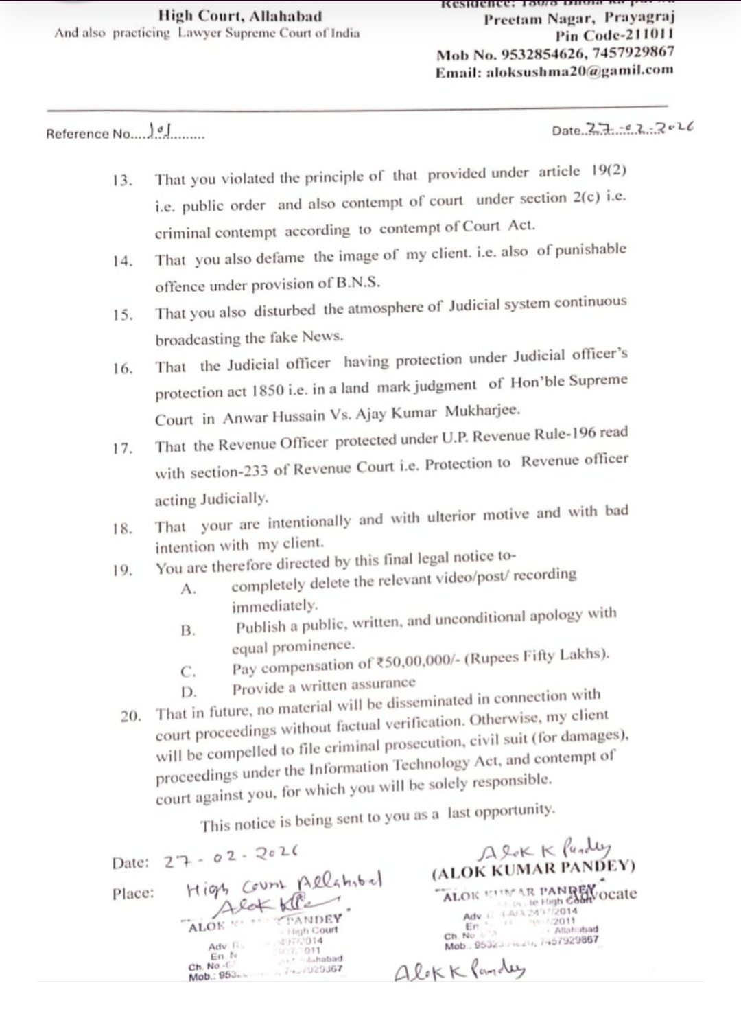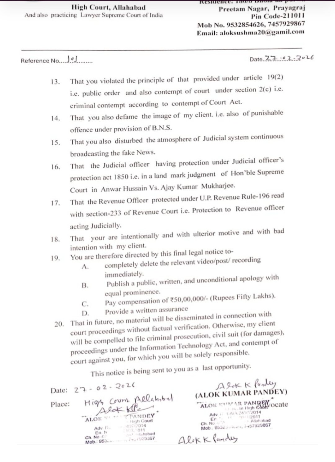 ​तहसीलदार राखी शर्मा ने कोर्ट के माध्यम से स्पष्ट चेतावनी दी है कि रंजीत गुप्ता को 7 कार्य दिवसों के भीतर अपना लिखित जवाब दाखिल करना होगा। नोटिस का लहजा साफ है—या तो सबूत दो, या फिर मानहानि और भ्रामक खबर फैलाने के जुर्म में गंभीर कानूनी कार्रवाई झेलने के लिए तैयार रहो। प्रशासन के इस कड़े रुख से जिले में ‘व्हाट्सएप यूनिवर्सिटी’ चलाने वाले तथाकथित खबरनवीसों के होश उड़े हुए हैं।