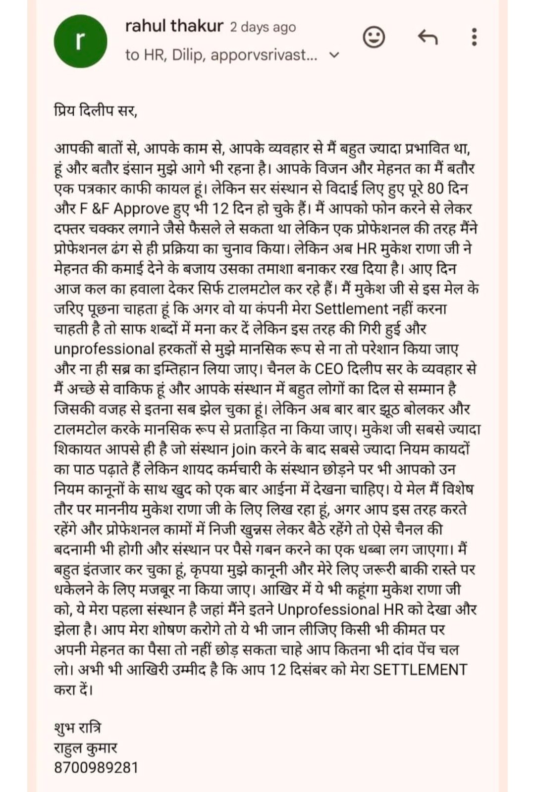 लाइव टाइम्स 80 दिन बीत जाने के बावजूद मेरा मेहनताना देने के बजाय सिर्फ टालमटोल करने में जुटा है। काफी मिन्नतों और बार-बार याद दिलाने के बाद संस्थान ने मुझे फुल एंड फाइनल का मेल भेजा, जिसमें पहले तो इस संस्थान की तरफ से मेरे 22 कामकाजी दिनों पर सवाल उठाया और करीब एक हफ्ते की सैलरी डकारनी चाही। मेरे आपत्ति दर्ज कराने के बाद जैसे तैसे 21 दिनों का वेतन देने पर राजी हुए, वो भी मेरे तीन महीने के दौरान किसी भी PL का भुगतान किए बिना, हालांकि मैंने उस पर भी अपनी सहमति जता दी लेकिन अब इस संस्थान का प्रबंधन मुझे इन 21 दिनों का भुगतान करने में भी हीला हवाली कर रहा है।